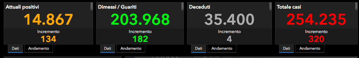 È di 14.867 (+134) persone attualmente positive, 35.400 (+4) morti, 203.968 (+182) guariti, per un totale di 254.235 (+320) casi, il bilancio inerente all’epidemia di Coronavirus in Italia emerso dal consueto bollettino quotidiano diffuso dal ministero della Salute e dalla Protezione Civile.Nell’ultimo giorno sono stati realizzati 30.666 tamponi a fronte dei 36.807 test effettuati nella giornata di ieri.