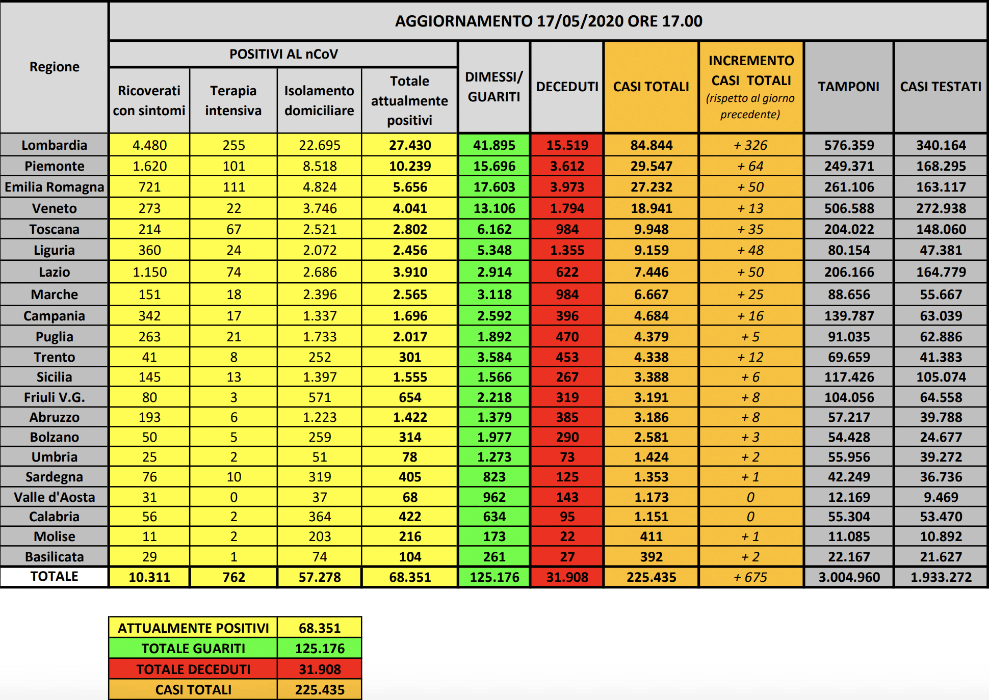 È di 68.351 (-1.836) persone attualmente positive, 31.908 (+145) decessi e 125.176 (+2.366) guariti, per un totale di 225.435 (+675) casi, l’odierno bilancio sull’epidemia di Coronavirus in Italia emerso come di consueto dal bollettino della Protezione Civile. Dei 68.351 attualmente positivi, 10.311 (-89) sono ricoverati in ospedale, 762 (-13) sono ricoverati in terapia intensiva, mentre 57.278 (-1.734) si trovano in isolamento domiciliare.
