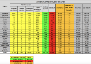 Dopo la decisione di sospendere definitivamente la consueta conferenza stampa delle 18, i dati inerenti all’emergenza Coronavirus in Italia sono stati diramati tramite un bollettino diffuso sul sito internet della Protezione Civile. Questi i numeri del bollettino di oggi, domenica 17 maggio.