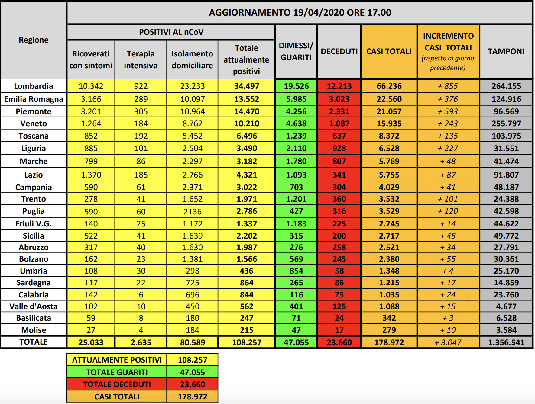 È di 108.257 (+486) persone attualmente positive, 23.660 decessi (+433) e 47.055 guariti (+2.128), per un totale di 178.972 casi (+3.047), il bilancio aggiornato dell’epidemia di Coronavirus in Italia emerso nell’ultimo bollettino della Protezione Civile. Delle 108.257 persone attualmente positive, 25.033 (+26) sono ricoverate con sintomi, 2.635 (-98) si trovano in terapia intensiva, mentre 80.589 (+558) sono in isolamento domiciliare.