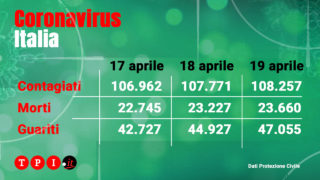 Dopo la decisione di rimodulare le conferenze stampa, che d’ora in avanti si terranno solamente due volte a settimana, sono stati diffusi sul sito internet della Protezione Civile i nuovi dati relativi all’emergenza Coronavirus in Italia contenuti nell’ultimo bollettino. Questi i numeri del bollettino di oggi, domenica 19 aprile.