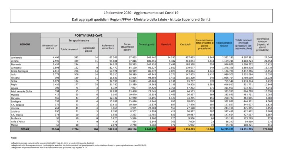 Secondo il bollettino di oggi, sabato 19 dicembre, sul Coronavirus in Italia pubblicato dal Ministero della Salute e dalla Protezione Civile, sono 16.308 i nuovi casi, contro i 17.992 di ieri, e 553 i morti (ieri erano stati 674), a fronte di 176.185 tamponi effettuati (ieri erano stati 179.800). Il tasso di positività oggi è del 9,2%, in flessione rispetto al 10% di ieri (-0,8%).