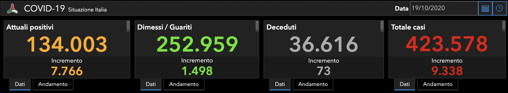 Il Ministero della Salute e la Protezione Civile hanno pubblicato il consueto bollettino sulla diffusione del Coronavirus in Italia aggiornato alla data di oggi, lunedì 19 ottobre 2020. Sono 9.338 i nuovi casi e 73 i morti registrati nell’ultimo giorno.