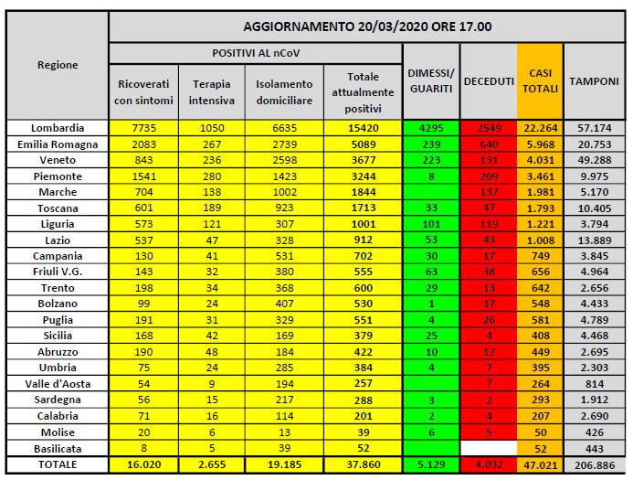 Secondo i dati raccolti oggi, in Italia ci sono 37.860 contagiati (ieri erano 33.190, +4.670), 4.032 morti (ieri erano 3.405, +627) e 5.129 guariti (ieri 4.440, +689). I casi totali, quindi, sono arrivati a 47.021 (ieri erano 41.035, +5.986). Il totale dei ricoverati con sintomi è di 16.020 (ieri 15.757, +263), mentre i pazienti in terapia intensiva sono attualmente 2.655 (ieri 2.498, +157). In isolamento domiciliare ci sono invece 19.185 persone (ieri 14.935, +4.250).