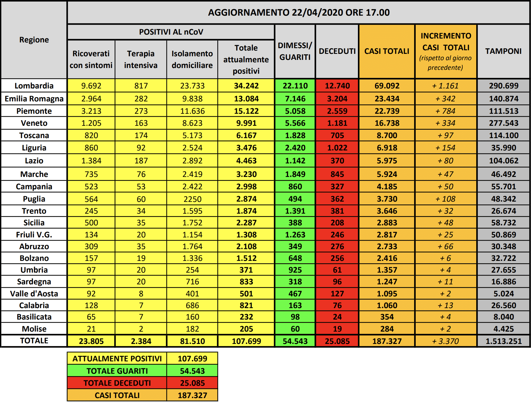 Dopo la decisione di rimodulare le conferenze stampa, anche oggi i dati inerenti all’emergenza Coronavirus in Italia sono stati diramati tramite un bollettino diffuso sul sito internet della Protezione Civile. Questi i numeri del bollettino di oggi, mercoledì 22 aprile.