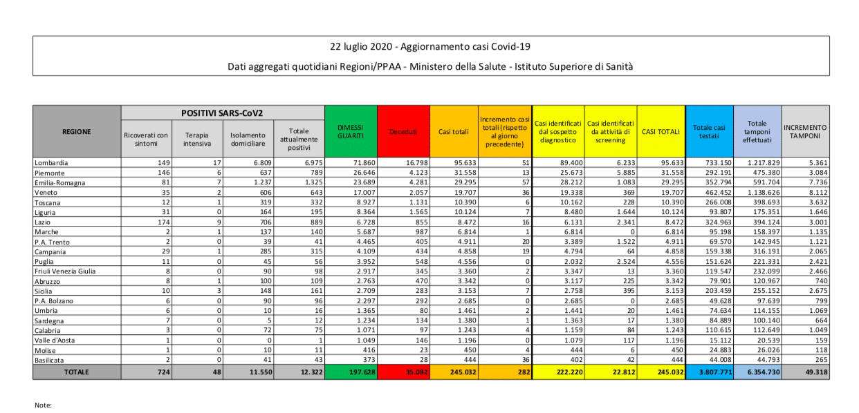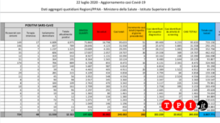 A partire dal 26 giugno i dati inerenti all’emergenza Coronavirus in Italia non vengono più diramati attraverso il bollettino diffuso sul sito Internet della Protezione Civile. I dati, infatti, sono ora disponibili sul sito del ministero della Salute. Questi i numeri del bollettino di oggi, mercoledì 22 luglio.