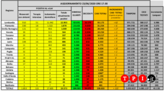 Dopo la decisione di sospendere definitivamente la consueta conferenza stampa delle 18, i dati inerenti all’emergenza Coronavirus in Italia vengono diramati attraverso un bollettino diffuso sul sito Internet della Protezione Civile. Questi i numeri del bollettino di oggi, martedì 23 giugno.