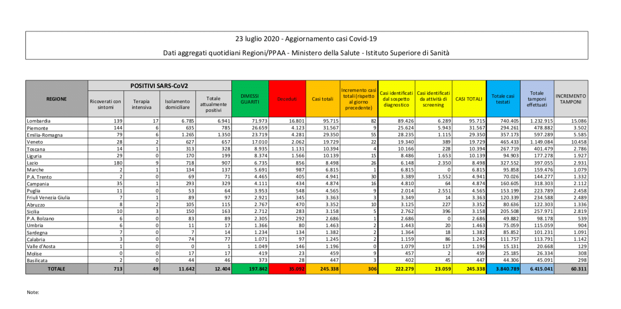 A partire dal 26 giugno i dati inerenti all’emergenza Coronavirus in Italia non vengono più diramati attraverso il bollettino diffuso sul sito Internet della Protezione Civile. I dati, infatti, sono ora disponibili sul sito del ministero della Salute. Questi i numeri del bollettino di oggi, giovedì 23 luglio.