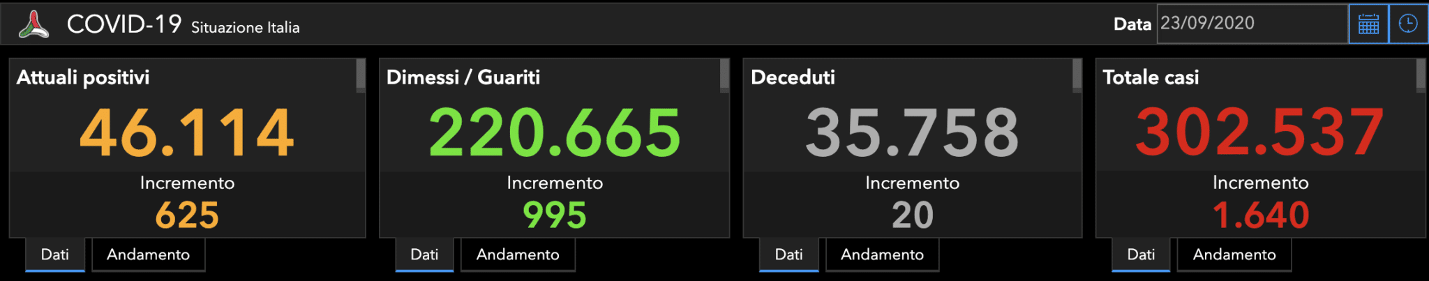 Il Ministero della Salute e la Protezione Civile hanno pubblicato il consueto bollettino sulla diffusione del Coronavirus in Italia aggiornato alla data di oggi, mercoledì 23 settembre 2020.