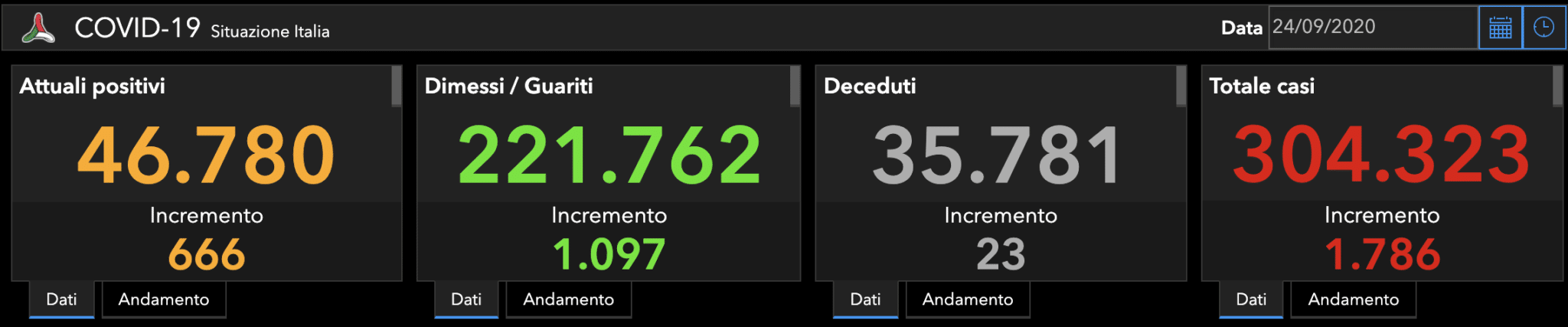 Il Ministero della Salute e la Protezione Civile hanno pubblicato il consueto bollettino sulla diffusione del Coronavirus in Italia aggiornato alla data di oggi, giovedì 24 settembre 2020.