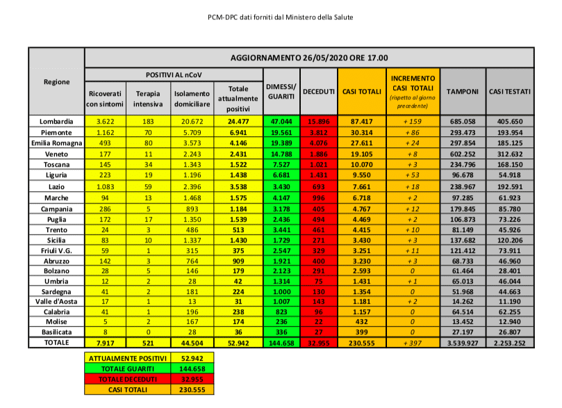 Dopo la decisione di sospendere definitivamente la consueta conferenza stampa delle 18, i dati inerenti all’emergenza Coronavirus in Italia vengono diramati attraverso un bollettino diffuso sul sito internet della Protezione Civile. Questi i numeri del bollettino di oggi, martedì 26 maggio.