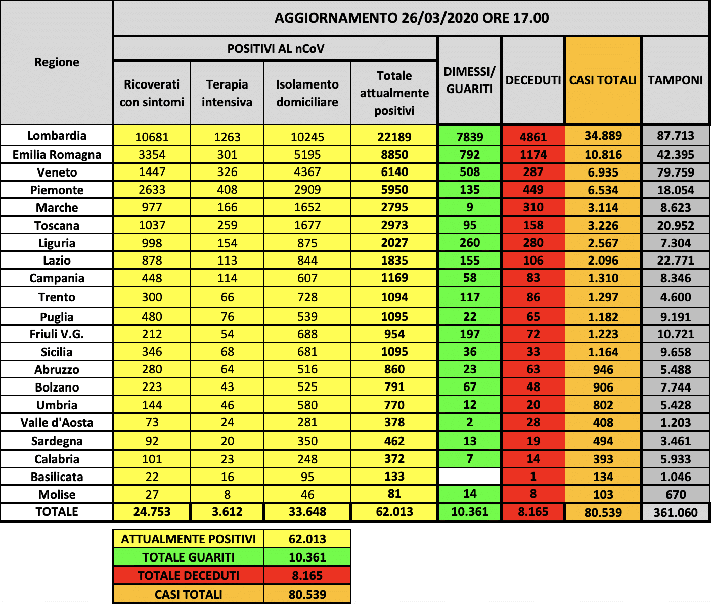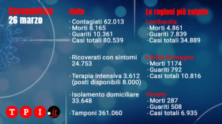 Coronavirus in Italia, il bollettino della Protezione civile di oggi, giovedì 26 marzo