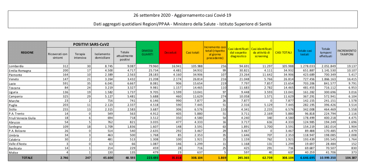 Il Ministero della Salute e la Protezione Civile hanno pubblicato il consueto bollettino sulla diffusione del Coronavirus in Italia aggiornato alla data di oggi, venerdì 25 settembre 2020.