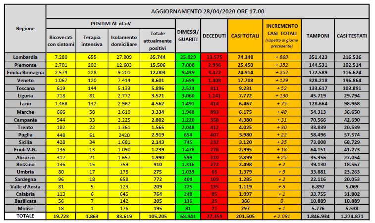 Dopo la decisione di rimodulare le consuete conferenze stampa delle 18, i dati inerenti all’emergenza Coronavirus in Italia sono stati diramati tramite un bollettino diffuso sul sito internet della Protezione Civile. Questi i numeri del bollettino di oggi, martedì 28 aprile.