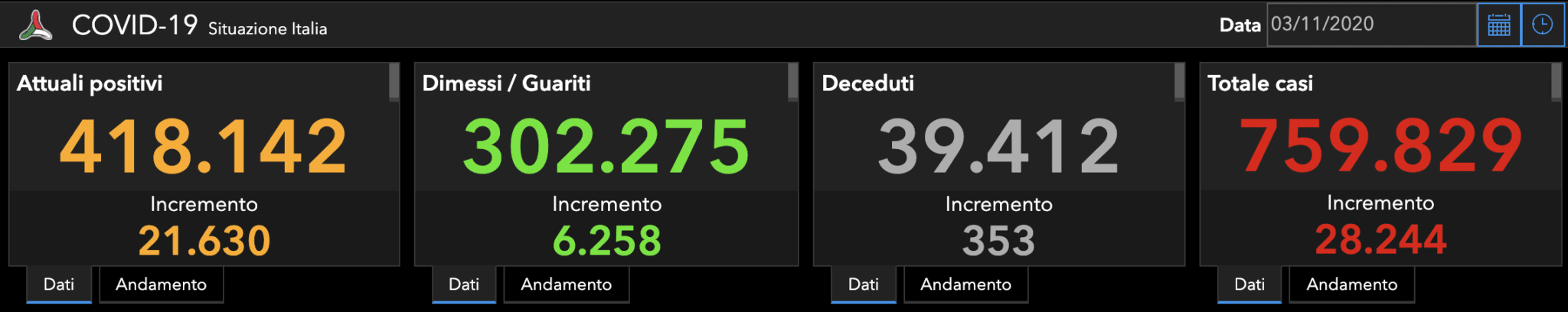 È di 418.142 persone attualmente positive (+21.630), 39.412 morti (+353), 302.275 guariti (+6.258), per un totale di 759.829 casi (+28.244), il bilancio inerente all’epidemia di Coronavirus in Italia emerso dal consueto bollettino quotidiano diffuso dalla Protezione Civile e dal ministero della Sanità. Dei 418.142 attualmente positivi, 21.114 (+1.274) sono ricoverati in ospedale, 2.225 (+203) necessitano di terapia intensiva, mentre 394.803 (+20.153) si trovano in isolamento domiciliare.