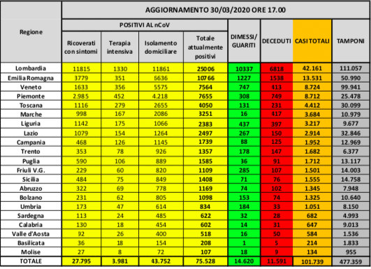 Come ogni giorno anche oggi, lunedì 30 marzo 2020, la Protezione civile ha fornito – nella consueta conferenza stampa delle ore 18 – i dati relativi all’epidemia di Coronavirus in Italia contenuti nell’ultimo bollettino.