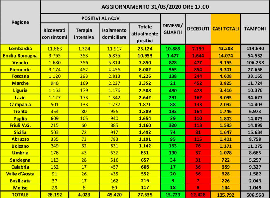 Come ogni giorno anche oggi, martedì 31 marzo 2020, la Protezione civile ha fornito – nella consueta conferenza stampa delle ore 18 – i dati relativi all’epidemia di Coronavirus in Italia contenuti nell’ultimo bollettino.
