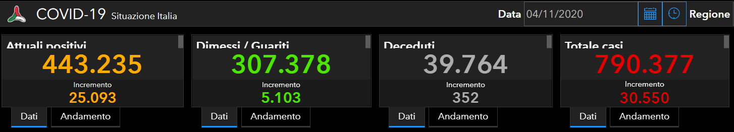 Dal bollettino è emerso che è di 443.235 persone attualmente positive (+25.093), 39.764 morti (+352), 307.378 guariti (+5.103), per un totale di 790.377 casi (+30.550), il bilancio inerente all’epidemia di Coronavirus in Italia. Dei 443.235 attualmente positivi, 22.116 21.114 (+1.002) sono ricoverati in ospedale, 2.292 (+67) necessitano di terapia intensiva, mentre 418.827 (+24.024) si trovano in isolamento domiciliare.