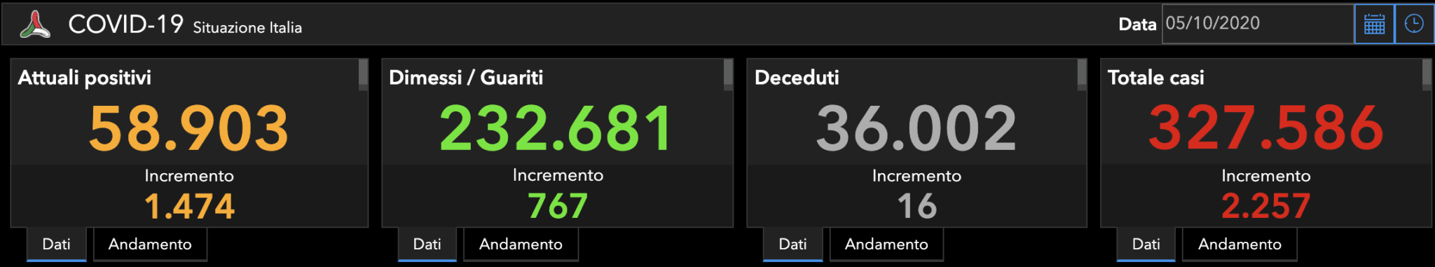Il Ministero della Salute e la Protezione Civile hanno pubblicato il consueto bollettino sulla diffusione del Coronavirus in Italia aggiornato alla data di oggi, lunedì 5 ottobre 2020.
