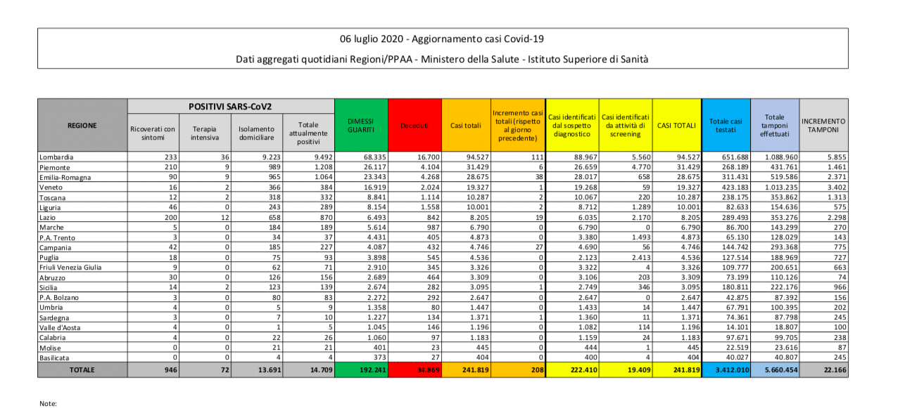 A partire dal 26 giugno i dati inerenti all’emergenza Coronavirus in Italia non vengono più diramati attraverso il bollettino diffuso sul sito Internet della Protezione Civile. I dati, infatti, sono ora disponibili sul sito del ministero della Salute. Questi i numeri del bollettino di oggi, lunedì 6 luglio.