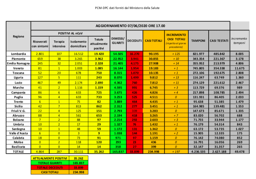 Dopo la decisione di sospendere definitivamente la consueta conferenza stampa delle 18, i dati inerenti all’emergenza Coronavirus in Italia vengono diramati attraverso un bollettino diffuso sul sito internet della Protezione Civile. Questi i numeri del bollettino di oggi, domenica 7 giugno.