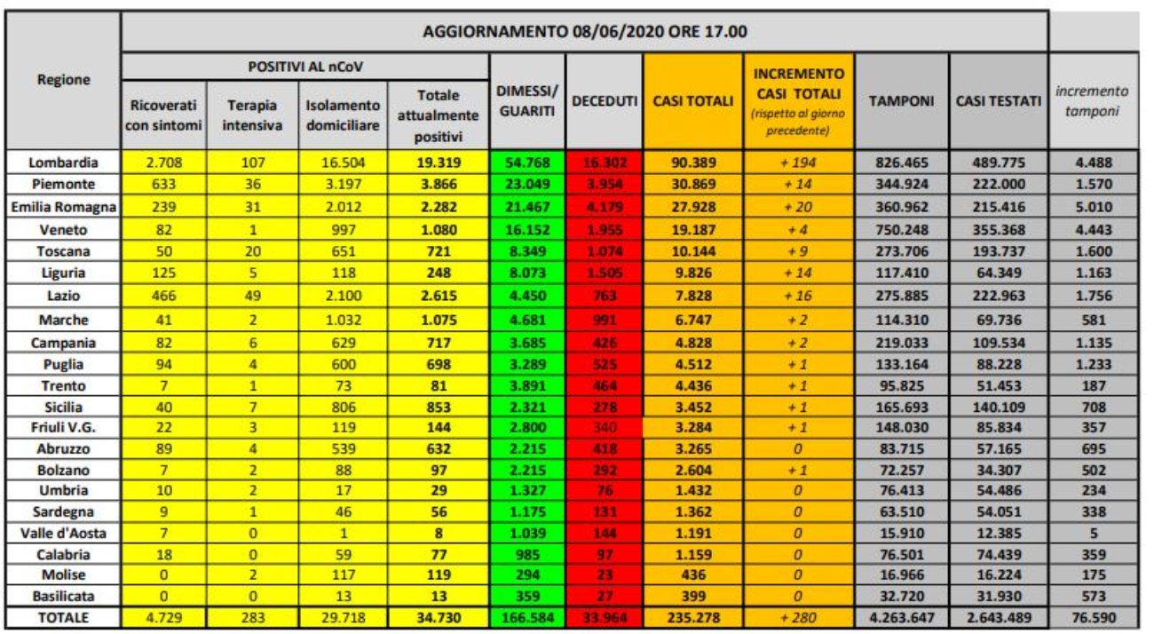 Dopo la decisione di sospendere definitivamente la consueta conferenza stampa delle 18, i dati inerenti all’emergenza Coronavirus in Italia vengono diramati attraverso un bollettino diffuso sul sito internet della Protezione Civile. Questi i numeri del bollettino di oggi, lunedì 8 giugno.