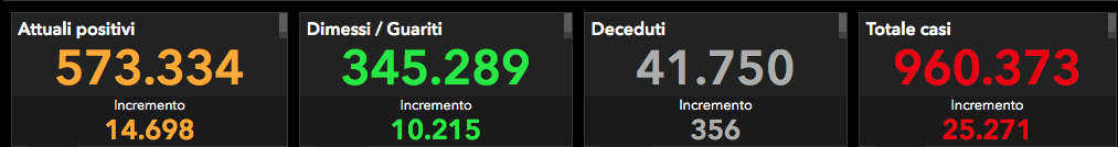 È di 573.334 persone attualmente positive (+24.271), 41.750 morti (+356), 345.289 guariti (+10.215), per un totale di 960.373 casi (+25.269), il bilancio inerente all’epidemia di Coronavirus in Italia emerso dal bollettino di oggi diffuso dalla Protezione Civile e dal ministero della Sanità. Dei 558.636 attualmente positivi, 27.636 (+1.196) sono ricoverati in ospedale, 2.849 (+100) necessitano di terapia intensiva, mentre 542.849 (+23.402) si trovano in isolamento domiciliare. Per quanto riguarda il numero dei tamponi processati, sono stati 147.725, 43.419 dei 191.144 effettuati ieri.