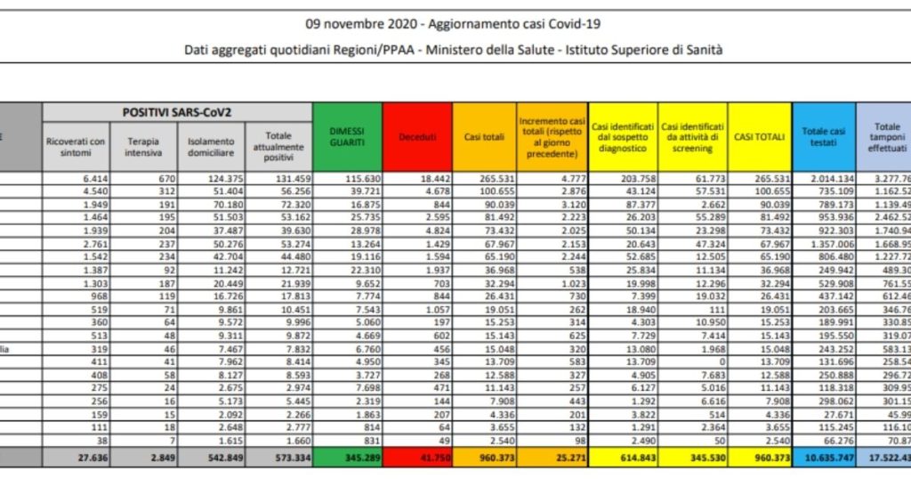 BOLLETTINO CORONAVIRUS OGGI – Il Ministero della Salute e la Protezione Civile hanno pubblicato il consueto bollettino sulla diffusione del Coronavirus in Italia aggiornato alla data di oggi, lunedì 9 novembre 2020. Sono 25.271 i nuovi casi, con 356 morti.