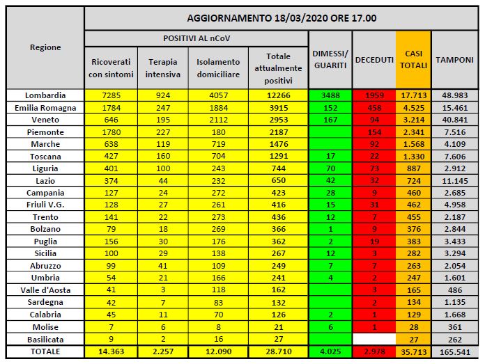 CORONAVIRUS ITALIA ULTIME NOTIZIE – L’epidemia da Coronavirus, secondo l’ultimo bollettino della Protezione Civile, vede attualmente 28.710 contagiati, 2.978 morti, e 4.025 guariti, per un totale di 35.713 casi totali. La situazione in Lombardia sembra sempre più grave, con Paola Pedrini, segretaria per la Lombardia della Federazione italiana medici di medicina generale, che ha denunciato che i dati sui pazienti contagiati ” sono sottostimati di almeno 5 volte nella provincia di Bergamo”. Qui tutte le ultime notizie sulla pandemia di Covid-19 dal mondo. Di seguito, invece, tutte le ultime notizie sul Coronavirus in Italia, aggiornate in tempo reale.