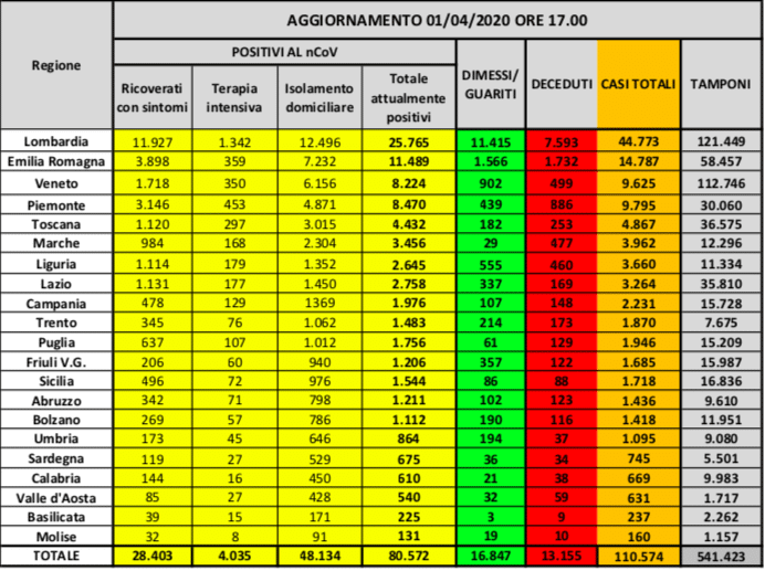 CORONAVIRUS ITALIA ULTIME NOTIZIE – L’emergenza Coronavirus in Italia non si arresta, ma la comunità scientifica concorda sul fatto che siano proprio questi i giorni in cui la curva dell’epidemia ha raggiunto il “picco”, dopo il quale il numero di contagi dovrebbe iniziare a diminuire. Secondo l’ultimo bollettino della Protezione Civile, in Italia il bilancio è di 80.5727 contagiati, 13.155 morti e 16.847 guariti per un totale di 110.574 casi registrati. Qui le ultime notizie sul Coronavirus nel mondo. Di seguito le ultime notizie di oggi, mercoledì 1 aprile 2020, sul Coronavirus in Italia, aggiornate in tempo reale.