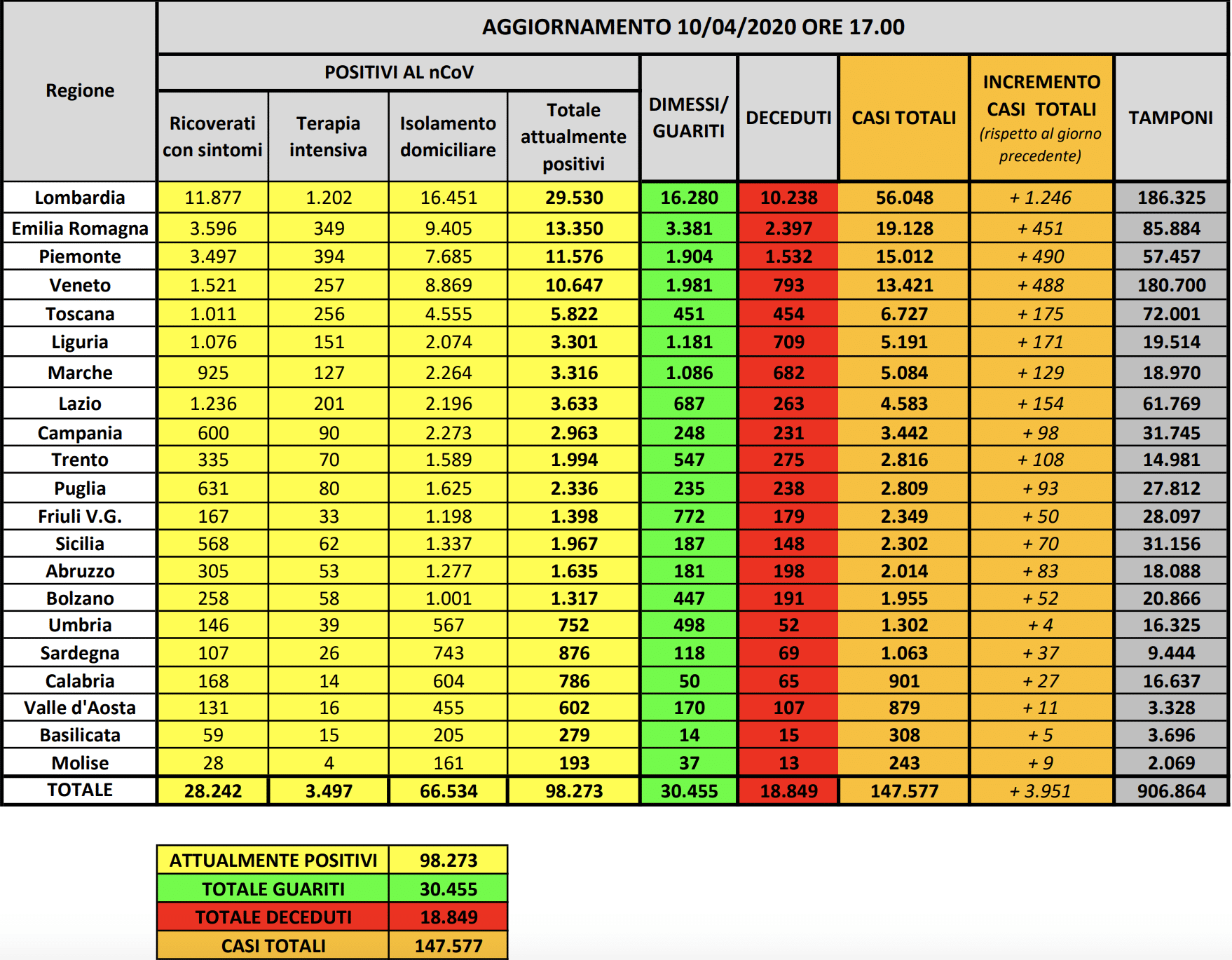 Ore 18,00 – Il bollettino della Protezione Civile – È di 98.273 positivi (+1.396), 18.849 morti (+570) e 30.455 guariti (+1.985) per un totale di 147.577 casi (+3.951) il nuovo bilancio inerente all’epidemia di Coronavirus in Italia emerso dall’ultimo bollettino diramato dalla Protezione Civile. Dei 98.273 attualmente positivi, 28.242 (-157) sono ricoverati in ospedale con sintomi, 3.497 (-108) si trovano nei reparti di terapia intensiva, mentre 66.534 (+1.661) sono in isolamento domiciliare. Più o meno stabile, dunque, il numero dei nuovi positivi: oggi sono 1.396 i nuovi contagiati, a fronte dei 1.615 di ieri e dei 1.195 registrati l’altro ieri. Stabile, purtroppo, anche il numero dei decessi: 570 i morti registrati oggi, mentre ieri erano stati 610, in rialzo rispetto all’altro ieri quando erano stati conteggiati 542 morti. La buona notizia arriva dai ricoveri ospedalieri e dai reparti di terapia intensiva che per il settimo giorno consecutivo registrano il segno meno. Per quanto riguarda i tamponi, invece, oggi sono stati effettuati 53.495 test a fronte dei 46.244 realizzati ieri e dei 51.680 dell’altro ieri. Il bollettino della Protezione Civile.