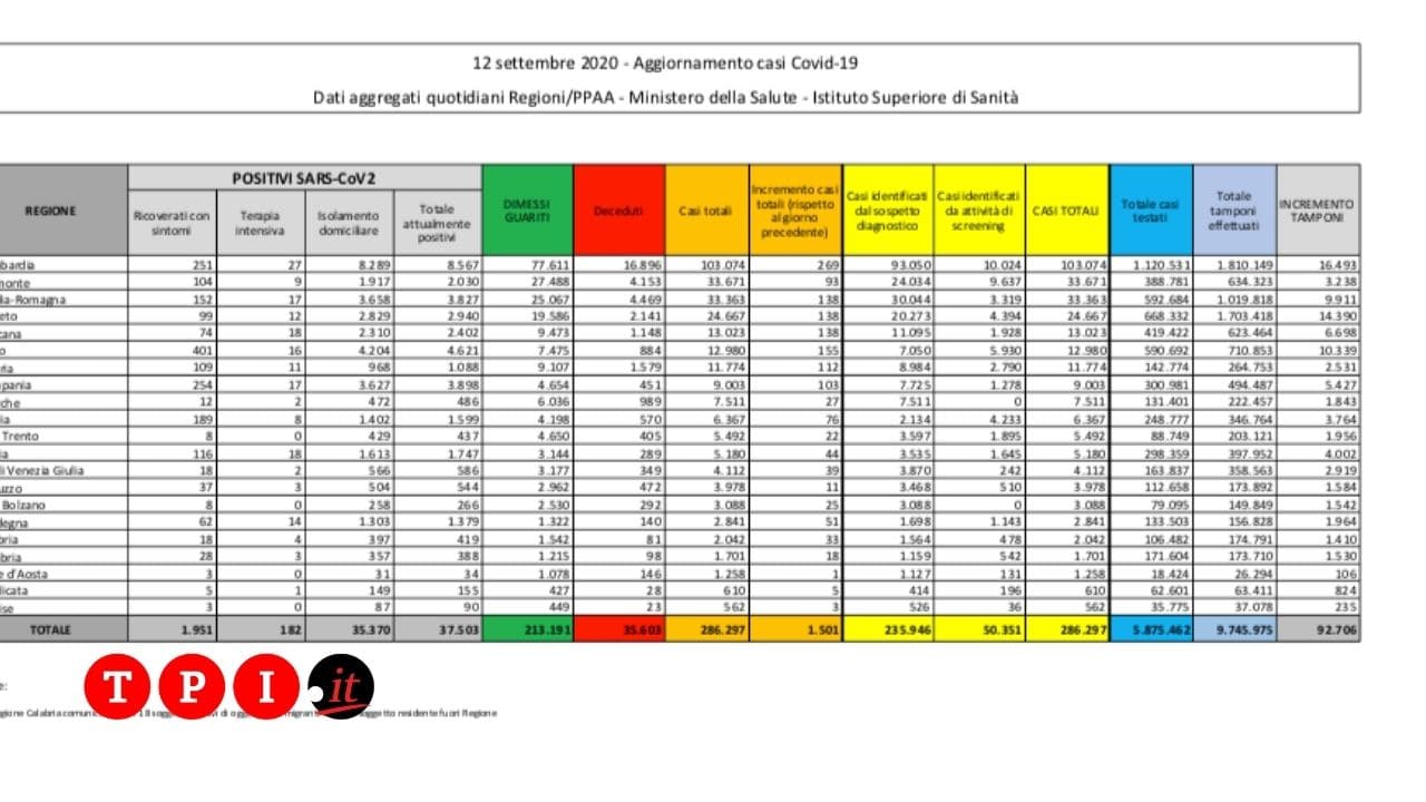 CORONAVIRUS ITALIA ULTIME NOTIZIE – Sono 36.767 le persone attualmente positive al Coronavirus in Italia, che finora ha contagiato 284.796 cittadini provocando 35.597 morti. Pandemia che, al momento, vede il grosso dei contagi all’estero, in particolare negli Stati Uniti e India (qui le ultime notizie sul Covid nel mondo). Di seguito tutte le ultime notizie di oggi, sabato 12 settembre 2020, legate al Coronavirus in Italia, aggiornate in tempo reale.