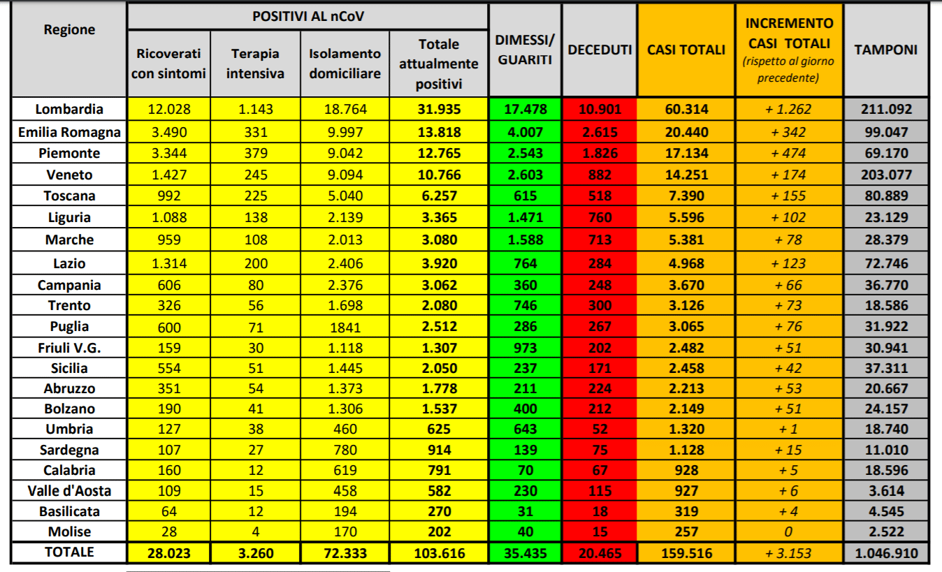 Ore 18 – Il bollettino della protezione civile: superati i 20mila morti in Italia. È di 103.616 positivi (+ 3.153 ), 20.465 morti (+566) e 35.435 guariti (+1.224) per un totale di 159.516 casi (+ 3.153) il nuovo bilancio inerente all’epidemia di Coronavirus in Italia nel bollettino di oggi. Dei 103.616 attualmente positivi, 28.023 (+176) sono ricoverati in ospedale con sintomi, 3.260 (-83) si trovano nei reparti di terapia intensiva, mentre 72.333 (+1270) sono in isolamento domiciliare (qui i dati completi).