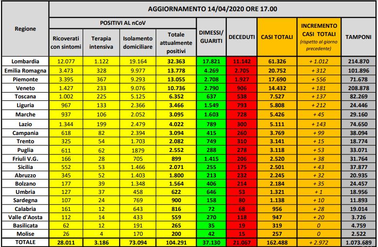 CORONAVIRUS ITALIA ULTIME NOTIZIE – Sono finora 162.488 i casi di Coronavirus in Italia, di cui 104.291 attualmente positivi, 21.067 morti e 37.130 guariti. Dopo un mese di lockdown, il trend della pandemia sembra in fase di lenta discesa. Le misure restrittive anti-contagio sono state prorogate fino al 3 maggio, ma da oggi alcune attività – come librerie e cartolerie – potranno riaprire (qui la lista dei negozie che riapriranno, con delle eccezioni in alcune regioni). L’Italia resta uno dei paesi più colpiti al mondo dal Coronavirus. Qui le ultime notizie sul Covid-19 nel mondo. Di seguito le ultime notizie dall’Italia sul Coronavirus, aggiornate in tempo reale, di oggi, 14 aprile 2020.