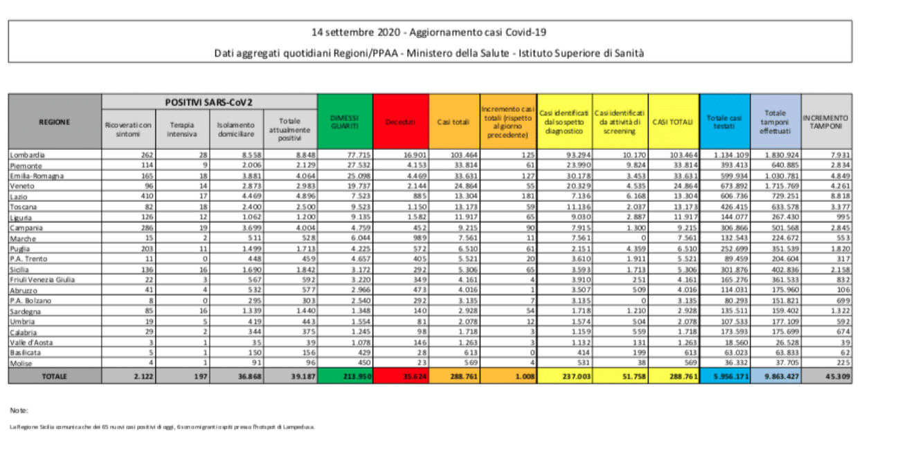 Ore 17,00 – Il bollettino – Il Ministero della Salute e la Protezione Civile hanno pubblicato il consueto bollettino sulla diffusione del Coronavirus in Italia aggiornato alla data di oggi, lunedì 14 settembre 2020. È di 39.187 (+678) persone attualmente positive, 35.624 (+14) morti e 213.950 (+316) guariti, per un totale di 288.761 (+1.008) casi, il bilancio inerente all’epidemia di Coronavirus in Italia emersa dal consueto bollettino diffuso dal ministero della Salute e dalla Protezione Civile. (Qui tutti i dati).