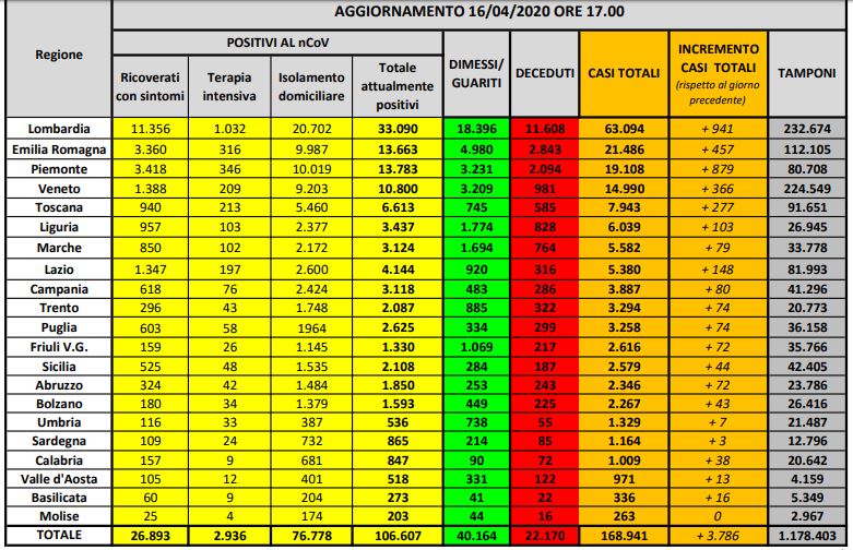 CORONAVIRUS ITALIA ULTIME NOTIZIE – In Italia i casi accertati di Coronavirus dall’inizio dell’emergenza sono 168.941: di questi 106.607 sono attualmente positivi, 22.170 sono morti e 40.164 guariti. Dall’inizio di aprile si assiste a una discesa dei contagi e delle persone ricoverate in ospedale. Mentre il Governo e la task force guidata da Colao stanno portando avanti il piano l’avvio dell’attesa Fase 2, si intensificano i controlli delle forze dell’ordine sulle Rsa. Qui le ultime notizie sul Covid-19 nel mondo. Di seguito le ultime notizie dall’Italia sul Coronavirus, aggiornate in tempo reale, di oggi, 16 aprile 2020.