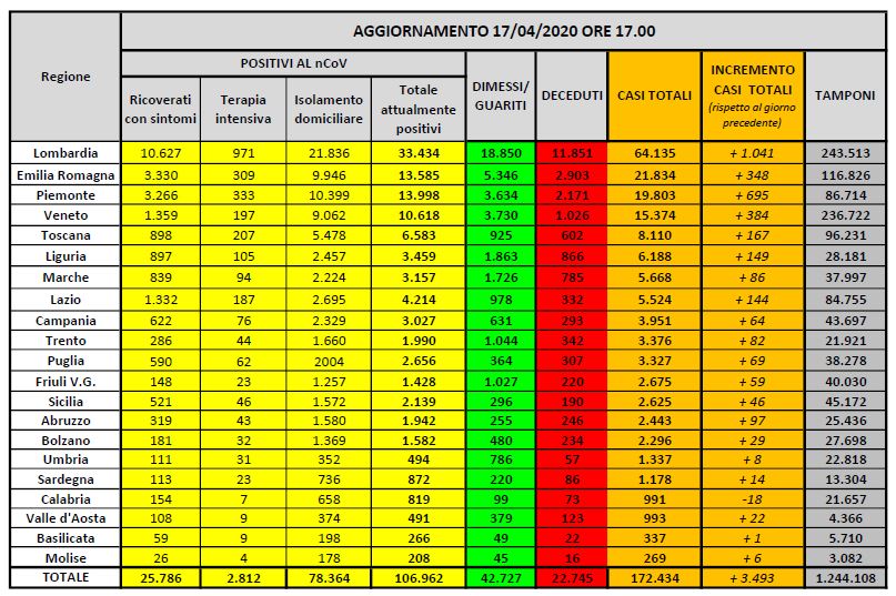 CORONAVIRUS ITALIA ULTIME NOTIZIE – In Italia il bilancio di casi positivi al Coronavirus è pari a 106.962, mentre dall’inizio dell’epidemia sono stati 22.745 i morti e 42.727 i guariti. Il numero dei casi totali ammonta dunque a 172.434, in leggero aumento rispetto al giorno precedente (+3.786). Ma ci sono anche stati molti più tamponi effettuati (oltre 16mila in più). Prosegue il lento ma continuo calo dei pazienti in terapia intensiva, che non era così basso dal 21 marzo. Qui le ultime notizie sul Covid-19 nel mondo. Di seguito le ultime notizie dall’Italia sul Coronavirus, aggiornate in tempo reale, di oggi, 17 aprile 2020.
