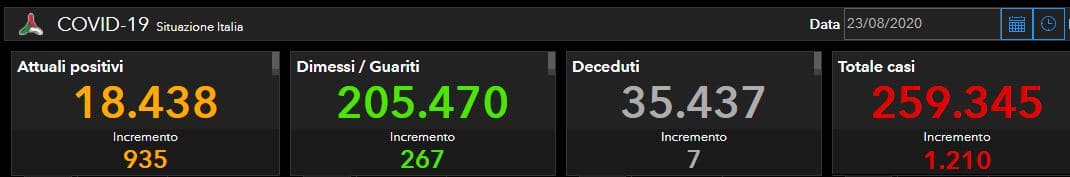 CORONAVIRUS ITALIA ULTIME NOTIZIE – Mentre si avvicina sempre di più la scadenza della riapertura delle scuole, preoccupa l’aumento dei contagi di Coronavirus in Italia: l’ultimo bollettino conta 1.210 nuovi positivi e 7 morti. L’epicentro del Covid-19 nel mondo resta peraltro tra Stati Uniti e Brasile (qui le ultime notizie sul Covid-19 nel mondo). Di seguito le ultime notizie dall’Italia sul Coronavirus di oggi, domenica 23 agosto 2020, aggiornate in tempo reale.