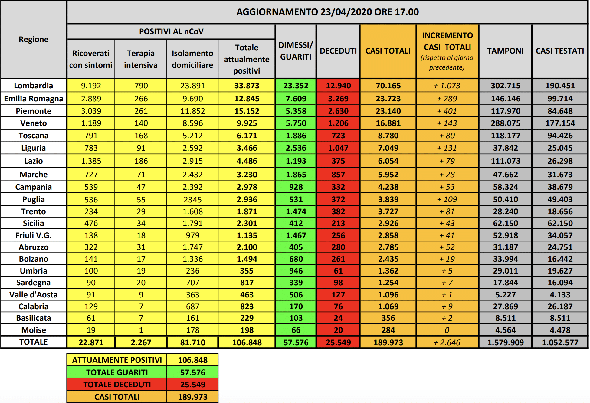 Ore 18,00 – Il bollettino della Protezione Civile – È di 106.848 persone attualmente positive (-851), 25.549 morti (+464) e 57.576 guariti (+3.033) per un totale di 189.973 casi (+2.646) il bilancio aggiornato dell’epidemia di Coronavirus in Italia secondo l’ultimo bollettino diramato dal capo della Protezione Civile Angelo Borrelli nel corso della seconda conferenza stampa settimanale. Dei 106.848 attualmente positivi, 22.871 (-934) sono ricoverati con sintomi, 2.267 (-117) sono ricoverati nei reparti di terapia intensiva, mentre 81.710 (+200) sono in isolamento domiciliare. Per la prima volta dall’inizio dell’epidemia, dunque, oggi si registrano più guariti che nuovi casi. Per il quarto giorno consecutivo, inoltre, continua il decremento degli attualmente positivi, che oggi fa registrare la cifra record di -851 rispetto al giorno precedente. Ieri, infatti, era stato registrato il dato di -10, mentre l’altro ieri quello di -528. Inoltre oggi si registra anche il nuovo record di guariti in una sola giornata: 3.033 (ieri erano stati 2.943, l’altro ieri 2.723). Confermato anche il decremento, che ormai è un dato consolidato da giorni, degli ospedalizzati e dei ricoverati in terapia intensiva. Per quanto riguarda gli ospedalizzati oggi si registra un -934 (ieri era -329), mentre per i ricoverati in terapia intensiva il dato è di -117 rispetto ai -87 di ieri. Oggi, inoltre, sono stati realizzati 66.658 tamponi a fronte dei 63.101 test effettuati ieri e dei 52.126 dell’altro ieri. Il bollettino della Protezione Civile.