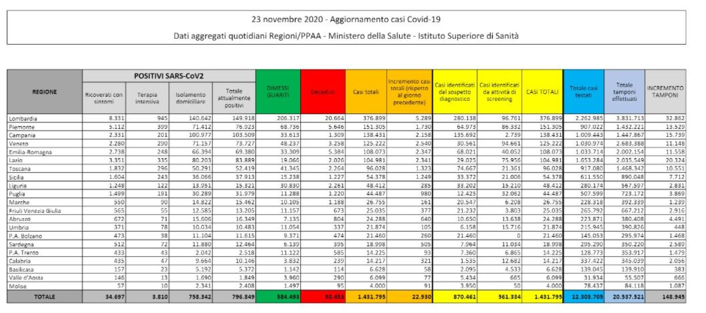 CORONAVIRUS ITALIA ULTIME NOTIZIE – Mostra qualche segno di rallentamento la pandemia di Coronavirus in Italia. Il bollettino di oggi ha registrato 22.930 nuovi positivi e un tasso di positività del 15,39%, ma a fronte di un numero relativamente basso di tamponi (148.945) come spesso accade nel weekend. Qui le ultime notizie sul Covid-19 nel mondo. Di seguito tutte le ultime notizie sul Coronavirus in Italia di oggi, lunedì 23 novembre 2020, aggiornate in tempo reale.