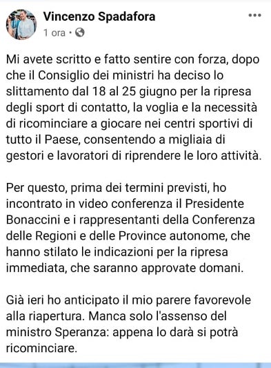 Ore 16,00 – Sport: attività sportive di contatto ai blocchi di partenza – Il calcio di serie A era già ripartito a metà maggio con le semifinali di Coppa Italia, le squadre nazionali azzurre si sono già ritrovate seguendo i protocolli sanitarie e a breve ripartirà anche il restante sport di contatto. Il semaforo verde alla ripartenza sembra essere ormai una questione di ore. Ad annunciarlo con un post sui social è stato Vincenzo Spadafora, il ministro per le Politiche giovanili e lo Sport, che attende l’assenso del ministro della Salute, Roberto Speranza. Far ripartire lo sport di contatto significa far ripartire una serie di attività legate all’attività sportiva. Significa riaprire piscine, palestre, palazzetti e migliaia di circoli sportivi che fino ai primi di marzo erano animate da agonisti ma anche da semplici amatori. Significa riattivare un importante aspetto dell’economia con i gestori degli impianti che in questi mesi hanno parecchio sofferto.