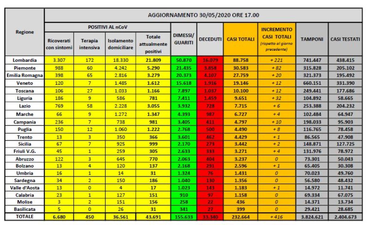 Il bollettino della Protezione Civile – Secondo il bollettino del 29 maggio della Protezione Civile le persone attualmente positive al Coronavirus in Italia sono 47.986, a fronte di 33.218 deceduti (+76 rispetto al giorno precedente) e 152.844 guariti (+2.240), per un totale di 232.248 casi (+516). Sono 7.094 (-285) le persone ricoverate in ospedale, 475 (-14) necessitano di cure in terapia intensiva, mentre 38.606 (-1.512) si trovano in isolamento domiciliare. In Lombardia ancora 354 nuovi casi, con 3.552 ricoverati con sintomi, 173 persone ricoverate in terapia intensiva, 18.958 in isolamento domiciliare e 38 morti registrati nelle 24 ore tra giovedì e venerdì.