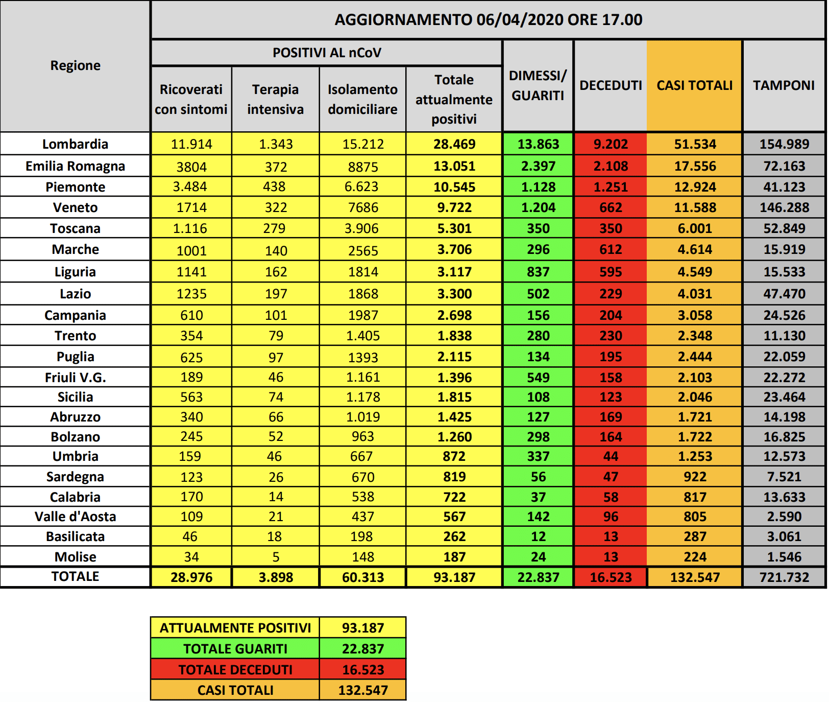 Ore 18.00 – Il bollettino della Protezione Civile – È di 93.187 positivi (+1.941), 16.523 deceduti (+636) e 22.837 guariti (+1.022) il nuovo bilancio fornito dal capo della Protezione Civile Angelo Borrelli sull’epidemia di Coronavirus in Italia. Fino ad ora sono 132.547 (+3.599) i casi totali registrati nel nostro Paese. Tra i 93.187 attualmente contagiati, 28.976 (+27) sono ricoverati con sintomi, 3.898 (-79) si trovano in terapia intensiva, mentre 60.313 (+1.993) si trovano in isolamento domiciliare. I dati, dunque, evidenziano un calo dei nuovi contagiati (1.941 registrati oggi a fronte dei 2.972 di ieri) e un nuovo calo per il terzo giorno consecutivo dei ricoveri in terapia intensiva che registra anche oggi un segno meno. Calano anche i ricoverati con sintomi presso le strutture ospedaliere: dai 28.949 di ieri ai 28.949 di ieri, con un incremento di sole 79 persone in più ricoverate. Per quanto riguarda i tamponi, oggi sono stati effettuati 30.271 test a fronte dei 34.237 realizzati nella giornata di ieri. Il bollettino della Protezione Civile.