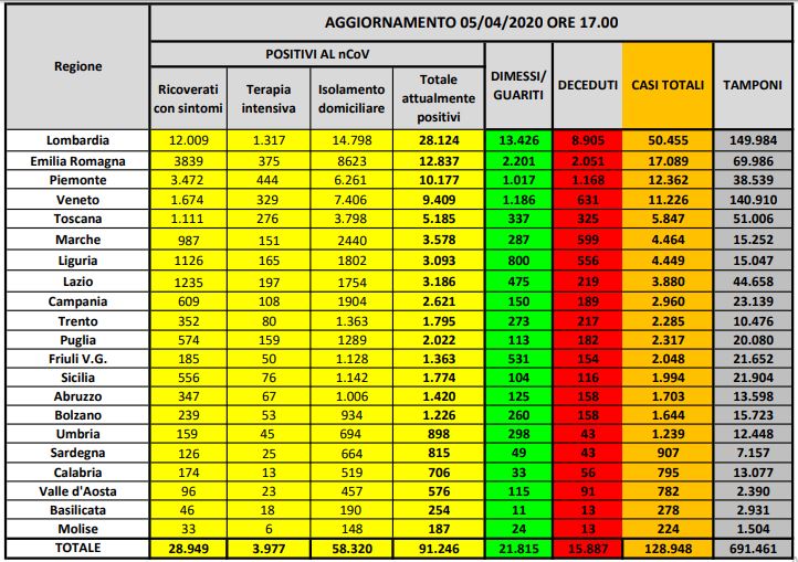 Il bollettino di oggi della Protezione civile – Il consueto bollettino della Protezione civile, presentato da Angelo Borrelli nella conferenza stampa di oggi, attesta che in Italia ci sono 91.246 contagiati (ieri erano 88.274 contagiati, +2.972), 15.887 morti (erano 15.362, +525) e 21.815 guariti (erano 20.996, +819), per un totale di 128.948 casi totali (ieri 124.632, +4.316). Il totale dei ricoverati con sintomi è di 28.949 (ieri 29.010), mentre i pazienti in terapia intensiva sono attualmente 3.977 (ieri 3.994). In isolamento domiciliare ci sono invece 58.320 persone (ieri 55.270). I tamponi effettuati oggi sono stati 34.237 (ieri 37.375). I morti, invece, ieri erano aumentati di 681, mentre oggi di 525. I guariti erano aumentati di 1.238, oggi di 819. Per il secondo giorno di fila calano i ricoverati in terapia intensiva. Per la prima volta, calano anche i ricoverati con sintomi, mentre aumentano i pazienti in isolamento domiciliare.