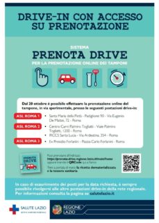 L’Unità di Crisi COVID-19 della Regione Lazio ha annunciato che parte oggi, 20 ottobre 2020, la sperimentazione del Sistema di prenotazione online dei tamponi drive in: dalle ore 14 sarà possibile prenotare, a partire dalla giornata di domani, mercoledì 21 ottobre, il tampone in uno dei seguenti drive in della Regione Lazio: