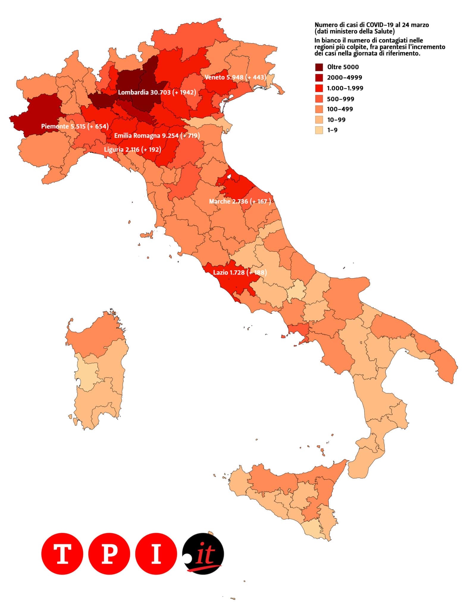 Di seguito, la mappa del contagio da Coronavirus in Italia, con colori più intensi nelle Regioni più colpite:
