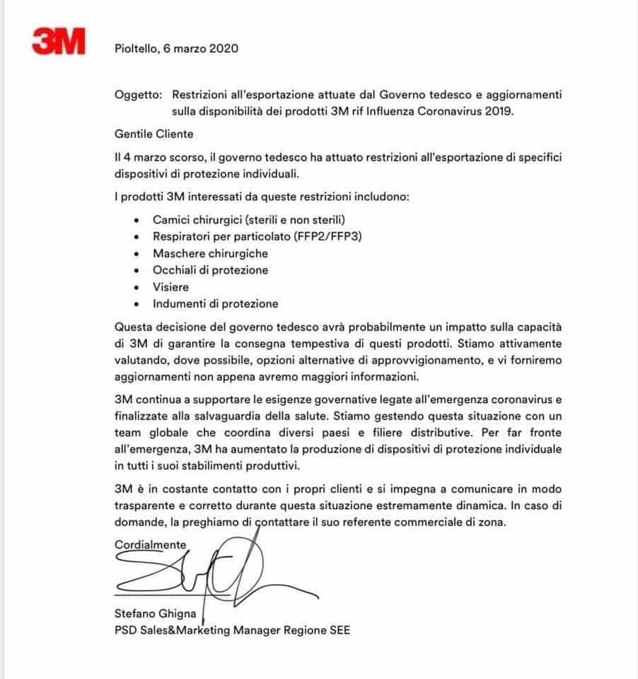 Nel caso specifico, 3M – specializzata nella produzione di prodotti e soluzioni per la protezione personale – opera in tutta Europa e non può far fronte a tutte le richieste che arrivano dall’Italia. La società comunque – viene specificato nella lettera – sta valutando soluzioni di approvvigionamento alternativo e attivato.