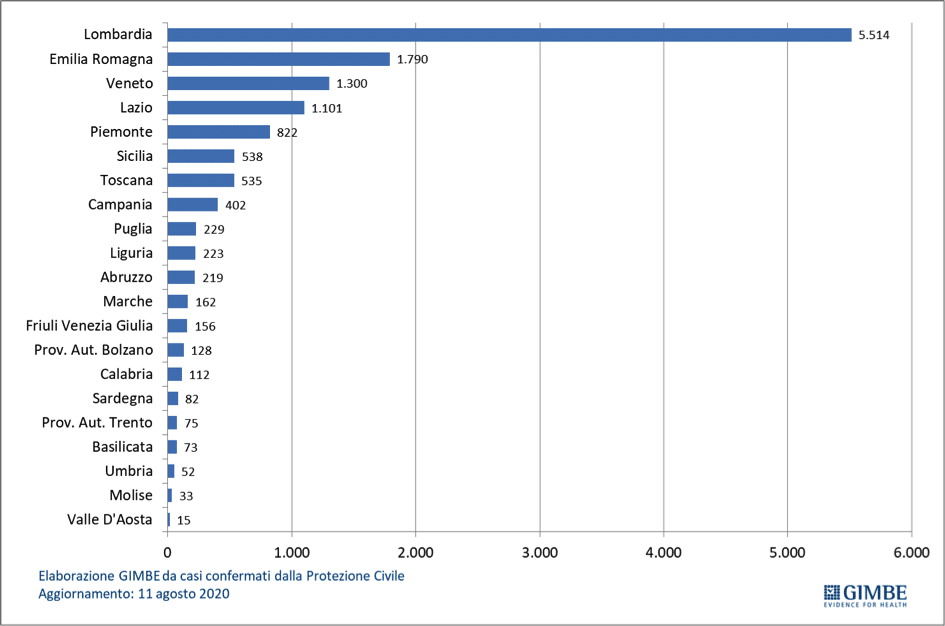 Il 40,7 per cento si concentra in Lombardia (5.514); un ulteriore 47,8 per cento si distribuisce tra Emilia-Romagna (1.790), Veneto (1.300), Lazio (1.101), Piemonte (822), Sicilia (538), Toscana (535), Campania (402); i rimanenti 1.559 casi (11,5 per cento) in 11 Regioni e 2 Province autonome con un range che varia dai 15 della Valle d’Aosta ai 229 della Puglia.