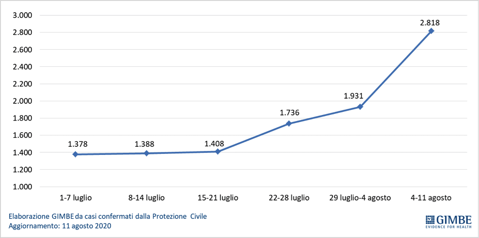 “In generale – spiega il presidente della Fondazione Gimbe – nell’ambito di un quadro epidemiologico di circolazione endemica del virus, è evidente il trend in progressivo aumento dei nuovi casi, siano essi autoctoni, di importazione (stranieri) o di rientro da italiani andati in vacanza all’estero”. Infatti se nelle prime tre settimane di luglio i nuovi casi erano stabili (circa 1.400 per settimana), nelle ultime due sono progressivamente aumentati da: 1.736 nella settimana 22-28 luglio a 1.931 nella settimana 29 luglio–4 agosto e a 2.818 nella settimana 5–11 agosto.