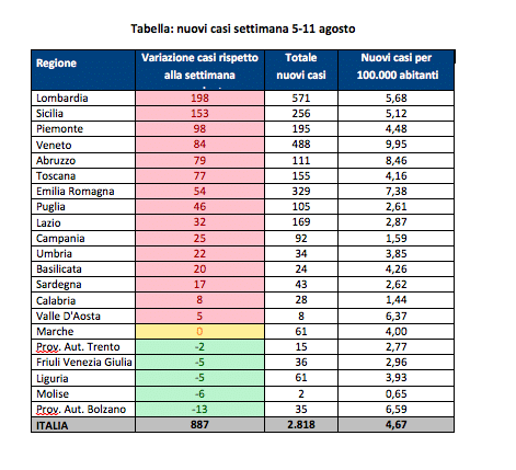 Anche nella settimana 5-11 agosto si registrano notevoli variabilità regionali: in 5 Regioni si rileva una riduzione complessiva di 31 nuovi casi rispetto alla settimana precedente, con variazioni minime che oscillano dai -2 della Prov. Aut. di Trento ai -13 della Prov. Aut. di Bolzano. 15 Regioni fanno registrare un aumento dei nuovi casi: svettano Lombardia (+198) e Sicilia (+153), mentre altrove gli incrementi oscillano dai +5 della Valle d’Aosta ai +98 del Piemonte. Stabile la Regione Marche.